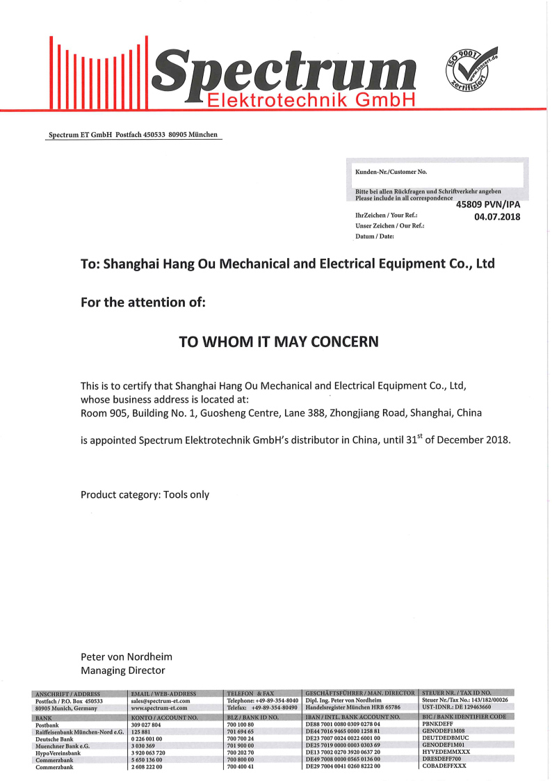 上海航欧自2018年起,正式成为德国SPECTRUM品牌的中国区授权销售商。