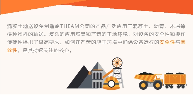 •   混凝土输送设备制造商THEAM公司的产品广泛应用于混凝土、沥青、木屑等多种物料的输送。复杂的应用场景和严苛的工地环境,对设备的安全性和操作便捷性提出了极高要求。如何在严苛的施工环境中确保设备运行的安全性与高效性,是其持续关注的核心。