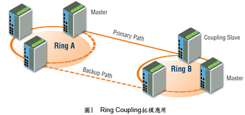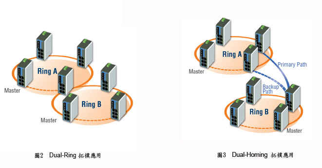 过去, Moxa Turbo Ring 能在 20 台以太网交换机全负载情况下,当网络故障异常时,系统将于极短的 300 ms 时间内迅速恢复正常运作,让系统不致于停摆,将损失降至最低。 2007 年, Moxa ,推出崭新的技术规格。全新一代 Turbo Ring ,当网络组件或线路发生错误或中断时,能于 20 ms 内将恢复系统正常运作 ,为目前世界上最快速的以太网络冗余环网规格;如此 15 倍数的成长,不但增加了系统规划弹性,也让数据的传送获得更高保障。 新一代 Turbo Ring 更提供多样弹性拓扑应用;对于 Turbo Ring 间的连接,提供 Ring Coupling 的功能 ( 图 1) ,让系统可以无限扩充与延伸,其原理与 Turbo Ring 相同,依然拥有主线路与备份线路,当主线路故障时,备用线路会立即启用,避免两个 Turbo Ring 之间通讯中断。此外, Dual-Ring ( 图 2) 功能,可通过一台交换机连接二个 Turbo Ring 环网,提高规划弹性及降低布线成本; Dual-Homing ( 图 3) 功能提供与既有网络连接并快速冗余的能力,或让原不具冗余功能的设备拥有冗余机制;这都是 Moxa 为了客户的应用与弹性所做的努力,针对网管型交换机, Moxa 近期将陆续提供在线韧体更新的服务以支持此全新 Turbo Ring 技术,为您带来更多的使用便利与规划弹性,创造更优质的工业以太网环境。