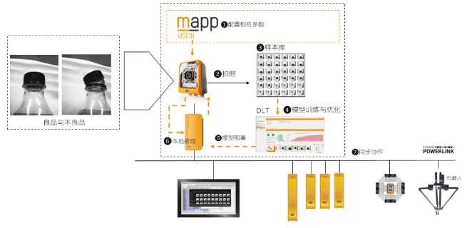 ●在相机的本地,可以直接检测到图片后,依据其学习到的能力,即可直接对产品进行缺陷智能识别,并无需PLC额外处理,并将结果输出给PLC进行处理。