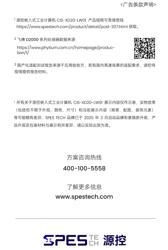 着眼于上述切实需求,SPES TECH 源控给出解决方案 —— 搭载飞腾 2000/8 处理器的嵌入式工业计算机 CIS-XD20-LW01,处理器达到 8 核,2.3GHz,TDP 40W,本机最大 64GB 内存1。