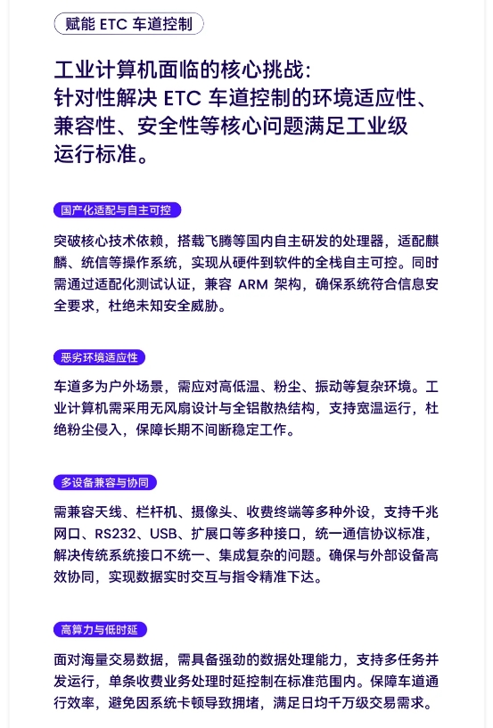 ETC 车道的户外复杂环境、多设备协同的高频交互、国产化替代的刚性要求,对工控机的性能、稳定性与适配性提出了综合考验。
