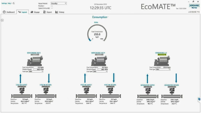 流量计的质量、密度和温度测量读数,都通过 Modbus 传输到 EcoMATE™ 系统。通过这种方式,EcoMATE™ 可以对船上的燃料消耗进行监测和报告,提供满足 MRV 和 IMO 要求的关键排放数据。此外,所有的实际读数都可以通过 EcoMATE™云模块获得,以便在陆上站点远程地监测和分析消耗数据。科隆还提供了其他必要的组件 — 一台取得船级社认证的带 23" 屏显的计算机、一台带 12" 面板的舰桥用计算机,以及电源设备和报告打印机。
