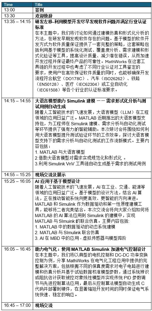 本次技术研讨会将通过演讲、方案演示、案例分享等方式,紧密结合各种行业案例,带您领略MATLAB/Simulink在安全关键软件开发、人工智能应用和电气化系统仿真和控制设计等领域的强大能力,帮助您在产品的性能和质量上高人一筹。